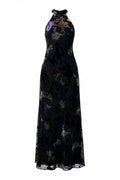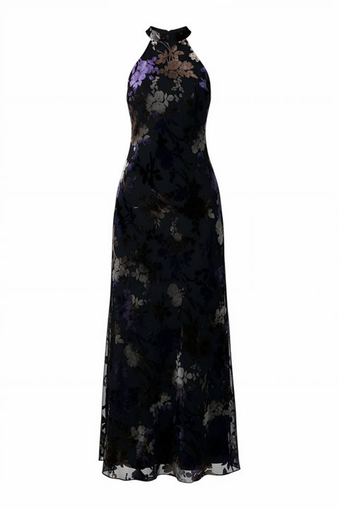 Mikael Aghal Black Floral Halter Gown – Sleeveless Maxi Evening Dress