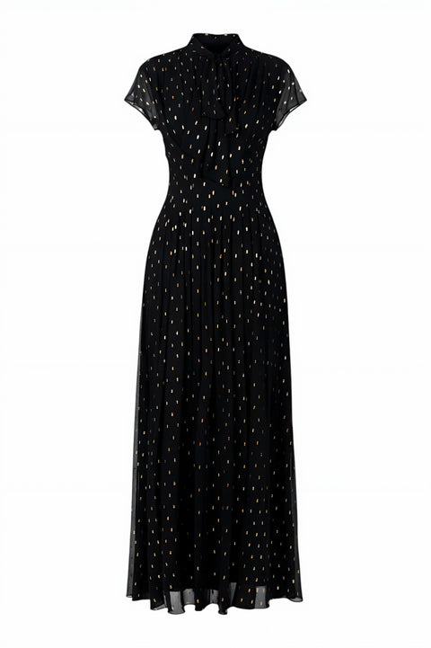 Mikael Aghal Black Metallic Dot Maxi Gown – Short Sleeve Tie Neck