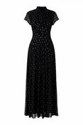Mikael Aghal Black Metallic Dot Maxi Gown – Short Sleeve Tie Neck